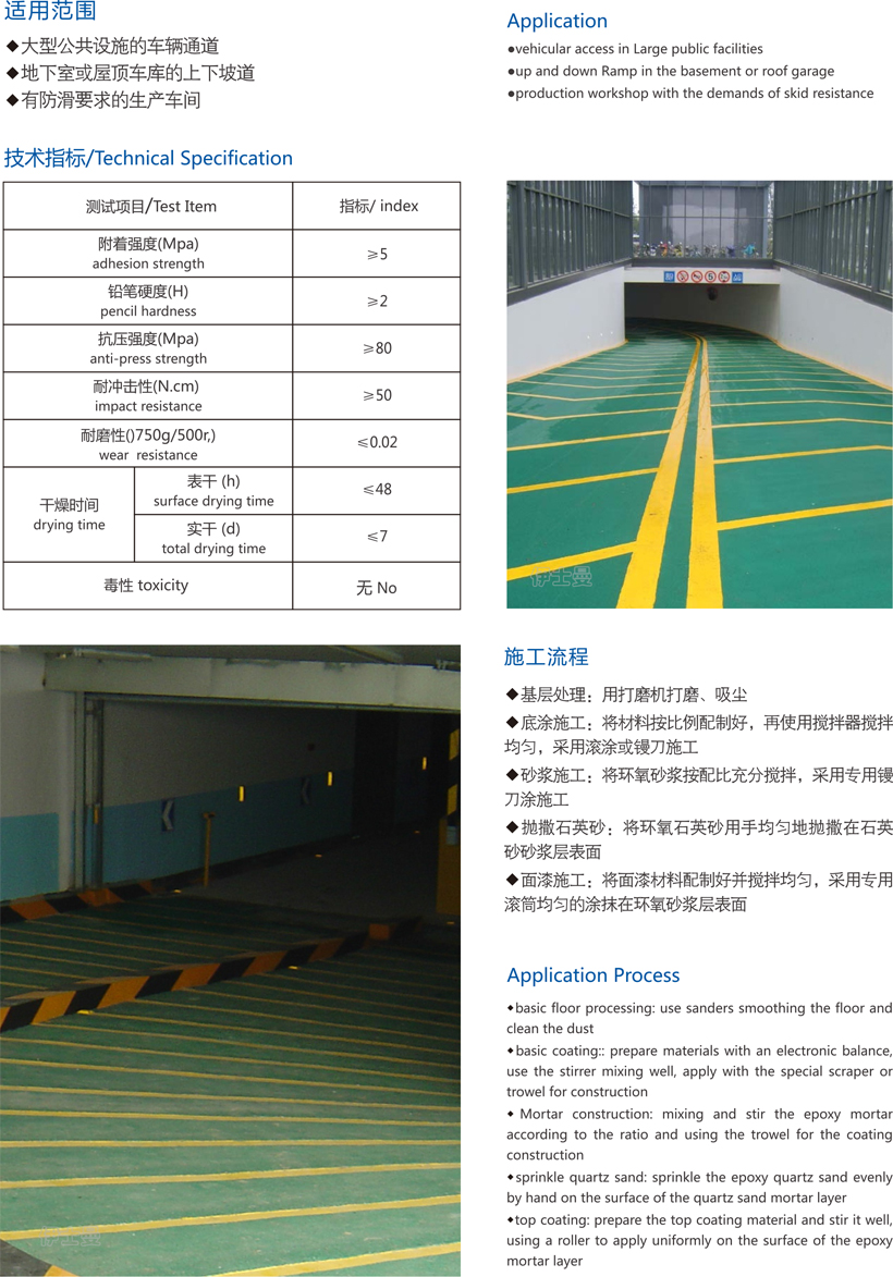 ES-E 106 is the use of solvent-free epoxy floor materials, after a special construction site made of the finished surface is not only beautiful and has a rough surface, to prevent the vehicle slipping down the ramp phenomenon. Reducing the friction between the vehicle tires and the lane noise, reducing the ordinary lane on the car and car tire damage, superior damping performance, ups and downs at the end. Therefore, the use of cement materials, the lane has long life; the surface of the imported resin closed, so that it has self-cleaning; anti-stress, abrasion resistance, easy construction.